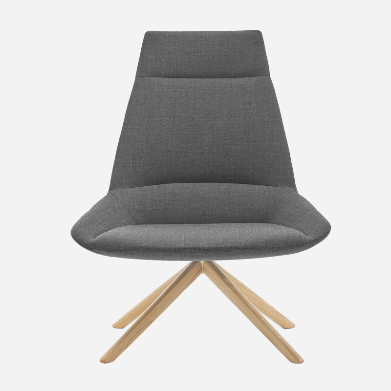 Fauteuil lounge rembourré dossier haut avec piètement en chêne.